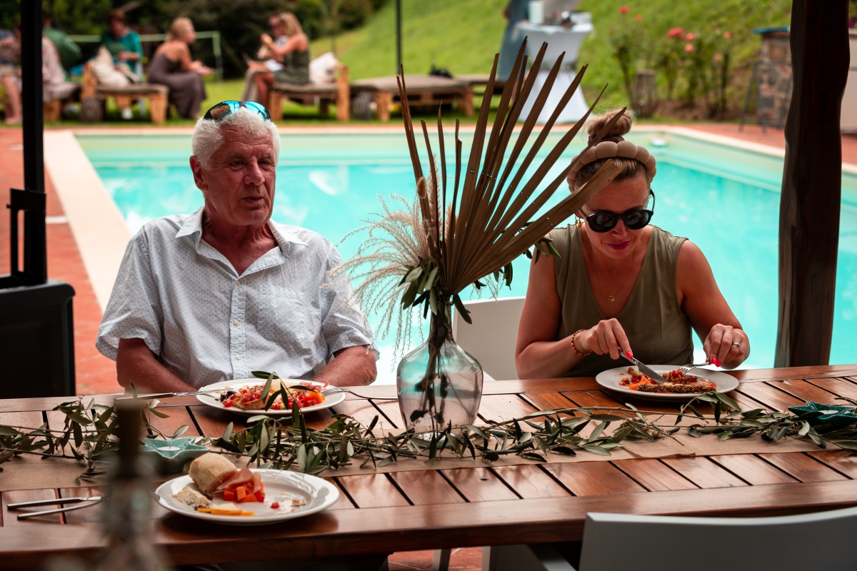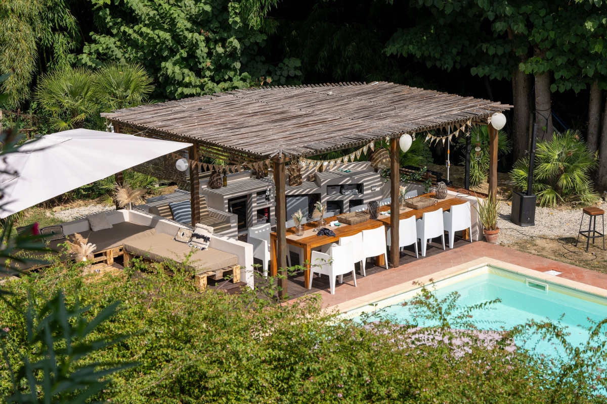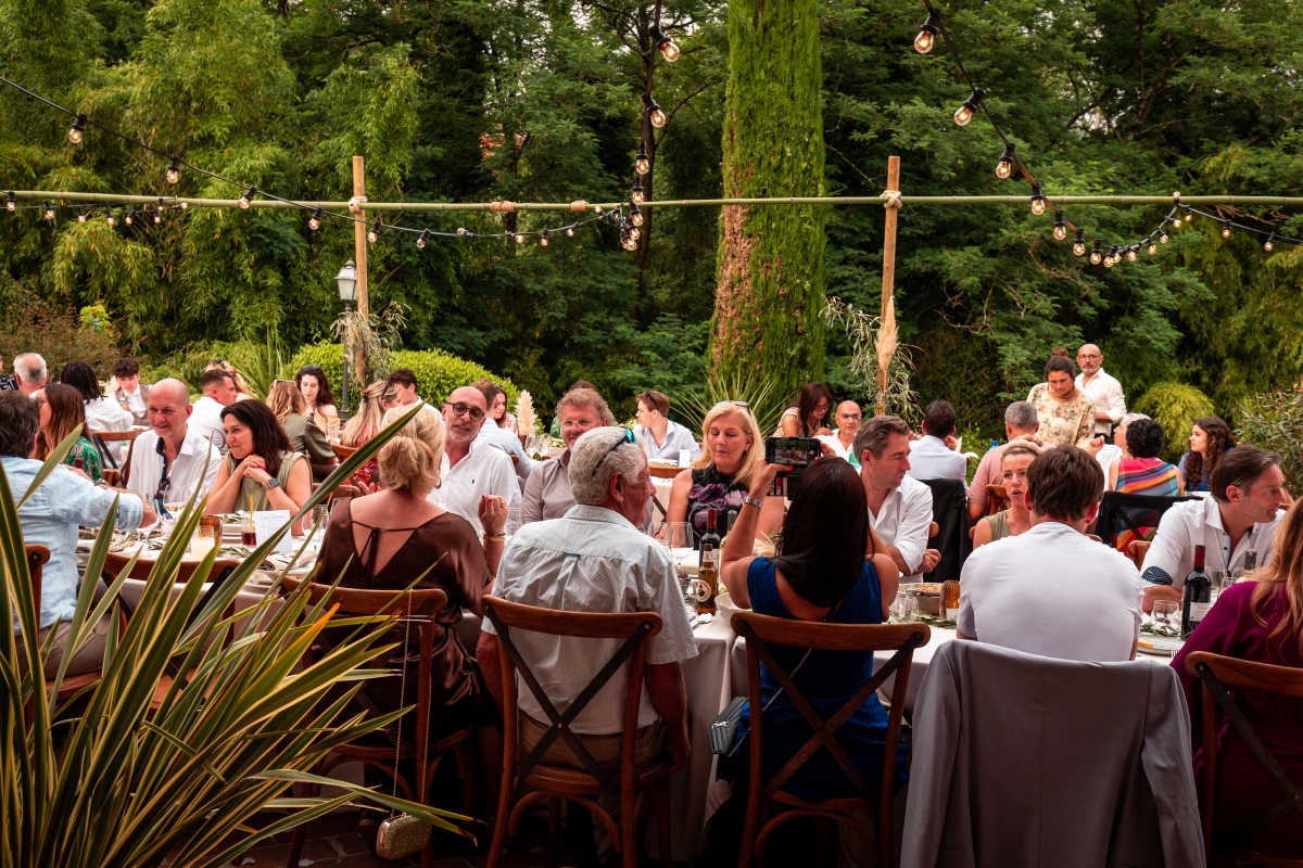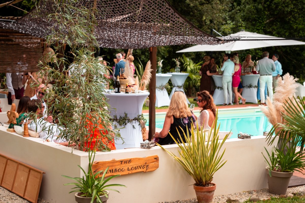 Een oogverblinded zwembad incl jacuzzi, sfeervol deels overdekt terras met een bar, loungebanken, statafels, rustieke tafels en stoelen gelegen in een dromerige omgeving vol met kleurrijke bloemen, palmbomen, romantische hagen van rozen en druiven en lange bamboe stalken. Aan dit terras ligt ook een eindeloos grasveld met uitzicht op de Toscaanse heuvels. Dit terras en omgeving is een ideale plek voor een receptie, cocktail party – of een voortreffelijke Italiaase, lunch, diner,  pizza of bbq evenement.