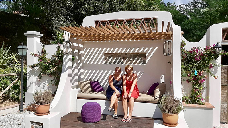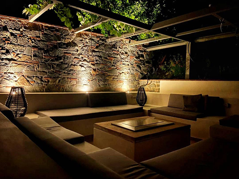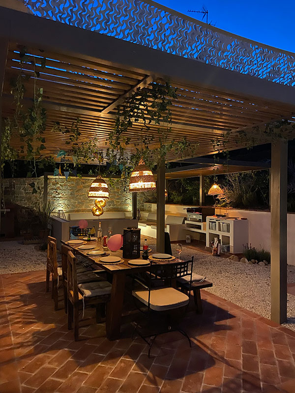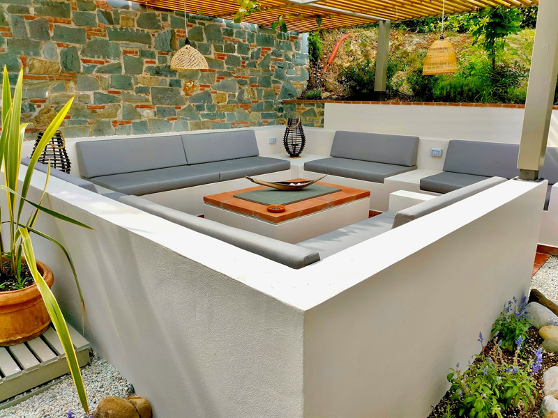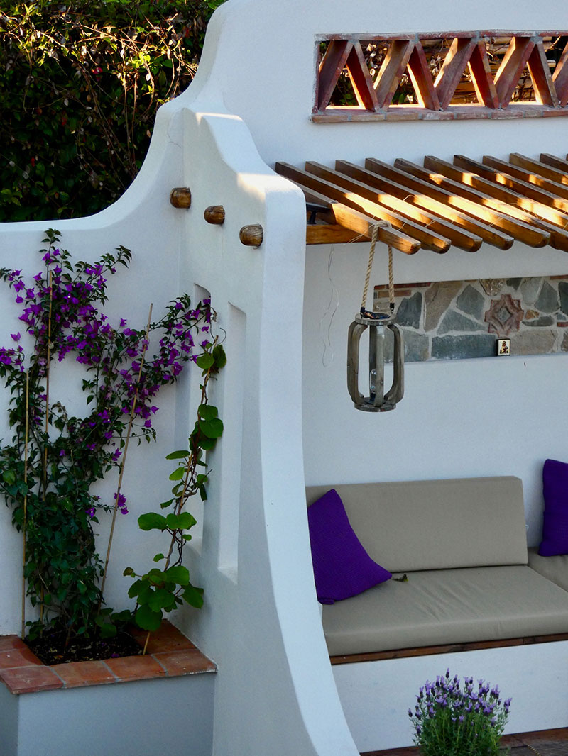 De betoverende loungebank met tropische invloeden in een mediterrane setting is omringd door roze bougainville en tropische kiwi. Dé perfecte plek voor een lome siësta of een ‘sunny sundowner’. De hout gestookte buitenhaard met ingebouwde barbecue is geheel in stijl met de tropische loungebank en de statige villa.
