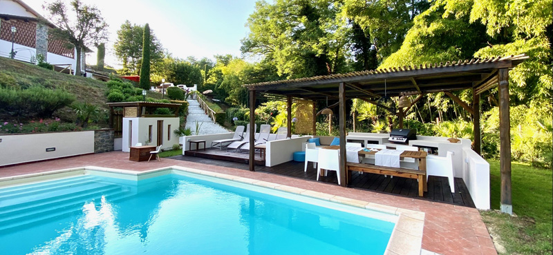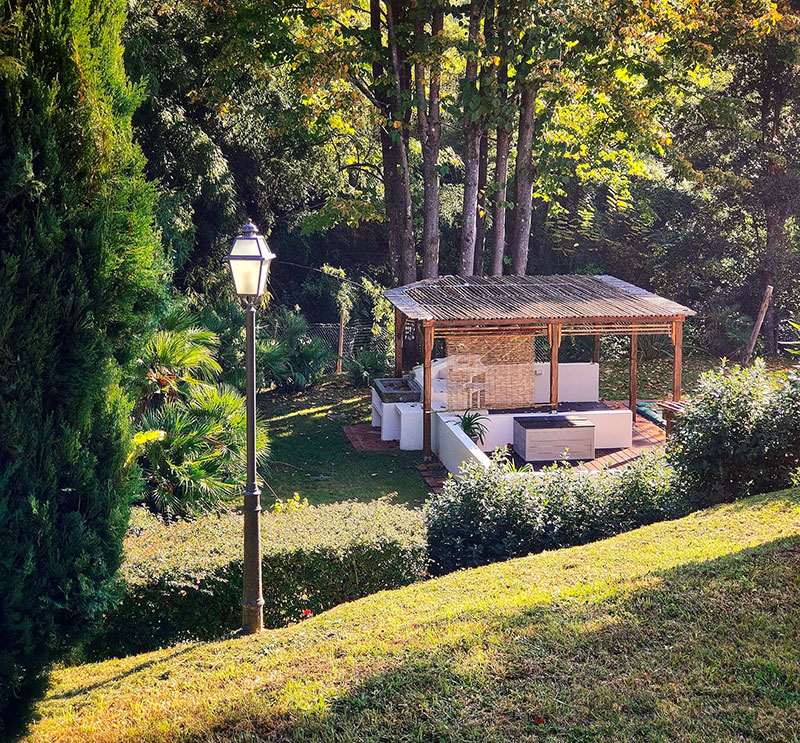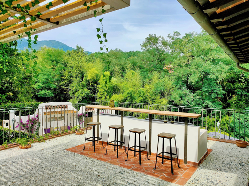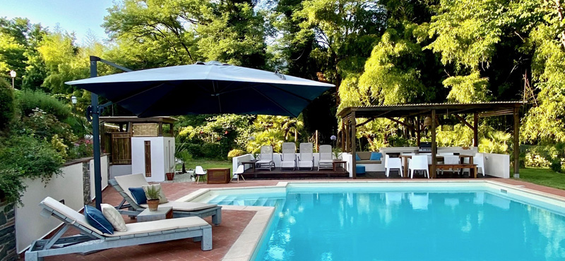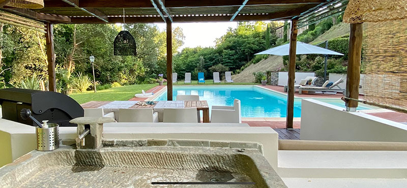 Al wandelend over een romantisch pad onder bloeiende rozen, druiven en zoet ruikende Toscaanse jasmijn bereik je de ‘eye-catcher’ van Villa Lucida. Het adembenemend subtropisch terras “The Bamboo Lounge” heeft een onweerstaanbaar groot zwembad (6×12 m), jacuzzi en buitendouche met omkleed gelegenheid. In de volledig ingerichte deels overdekte buitenkeuken met barbecue en koelkast, kan je na een verfrissende duik, heerlijk kokkerellen, grillen en genieten tot in de kleine uurtjes.
