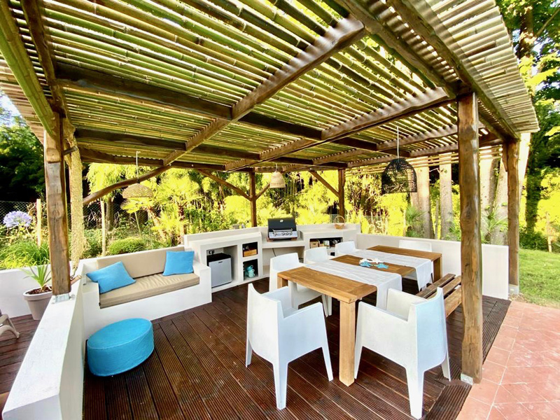 • Stijlvolle zithoek voor de hele familie met buitenhaard– gedeeltelijk overkapt.