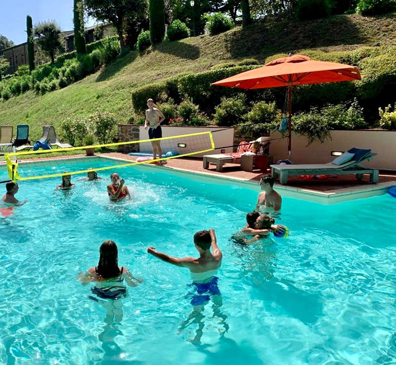 De lange teakhouten eettafel is perfect voor een ‘Al-fresco’ diner of smakelijke lunch met de Toscaanse heuvels en het lagergelegen zwembad als decor. Je kunt makkelijk een oogje in het zeil als de kinderen besluiten een verkoelende avondduik te nemen in het verlichte zwembad. De kinderen vermaken zich volop aan de pingpongtafel, de pooltafel, darts of herhalen de UEFA-cup finale ‘Nederland – Italië’ aan de tafelvoetbaltafel.